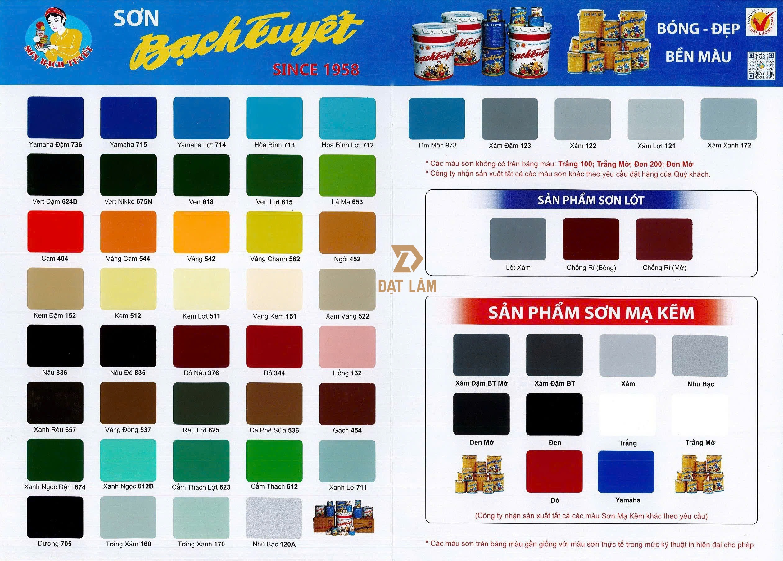 Bảng Màu Sơn Bạch Tuyết Sơn dầu Bach Tuyết Alkyd dùng cho gỗ và kim loại dùng để bảo vệ trang trí trên các bề mặt gỗ, sắt thép. Màng sơn bám tốt, cứng và dẻo, Độ bóng, độ che phủ cao, Nhanh khô, bền màu, Dễ sử dụng với...